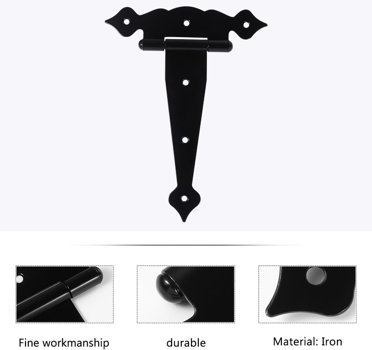 Package List 3 x door hinges Characteristics - Material: Iron Door Hinge. -Product Info:Black paint door hinge - Color: Black T Strap Hinges. - The shaft of the T hinges helps run more smoothly and reduce noise Wooden Door Hinge. - T-shaped design makes the hinges more convenient to open and close, the maximum rotation angle is up to 270 degree Decorative Hinge. - Professional and practical design with beautiful appearance, easy to carry and use Wooden Fences Hinge. - These door hinges are very practical and useful for various indoor and outdoor buildings, including various doors, sheds, windows, gates, fences, window wooden boxes and so on, also easy to install Gates Hinge. - Decorative T hinges with offset screw holes deisgn provide additional strength and prevent wood from splitting.Goods DescriptionWooden Door Hinge It is one of the for you.Door Hinge Are you looking for a professional, yet T strap hinge? Are you in search of a sturdy, trustworthy tool that can do multiple works at once? , ! Our professional T strap hinge must meet you needs