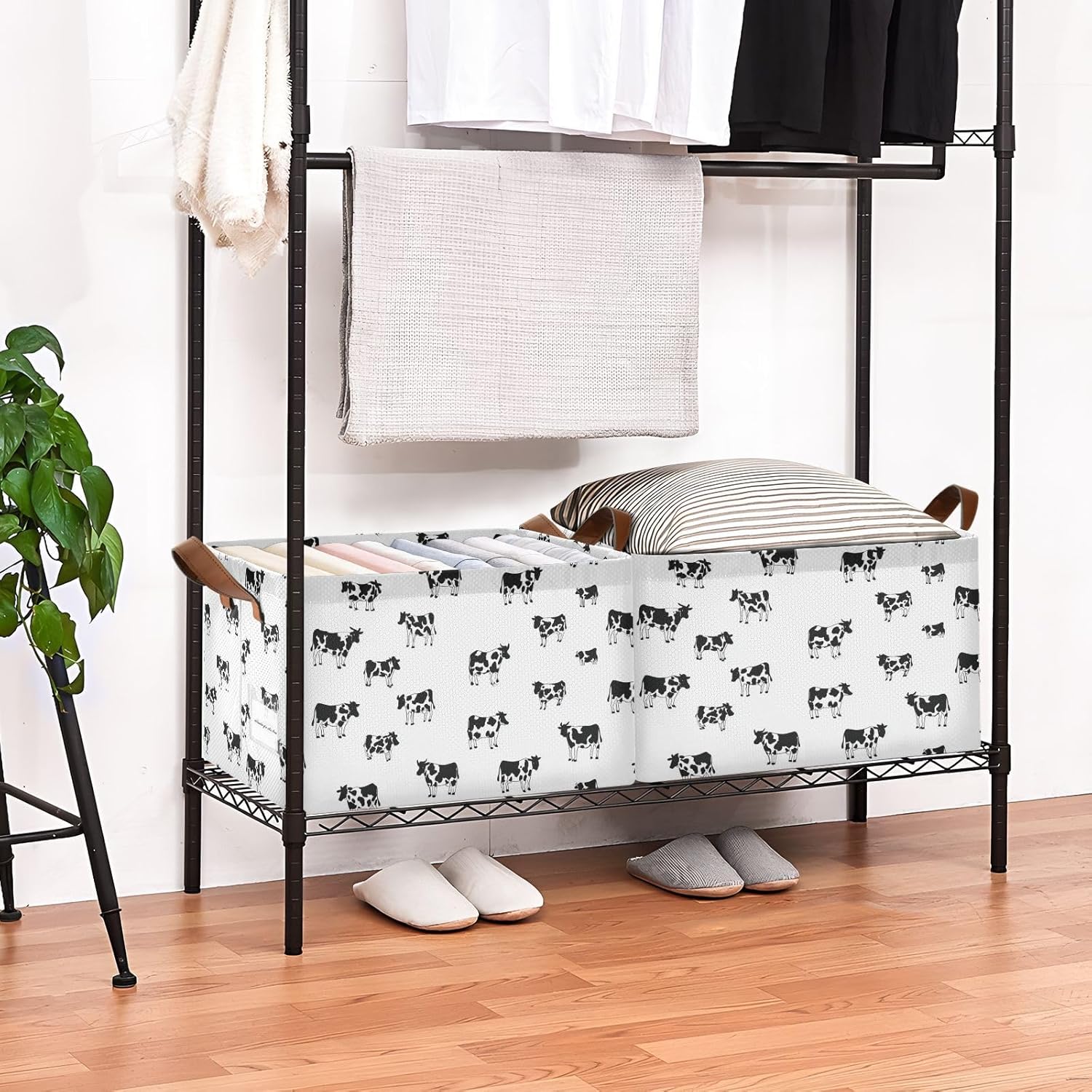 YNNALE storage bins have spacious capacity, measures 16.9(L)" x 11.4(W)" x 10(H)"; this large size enables you to store a wide variety of items to keep your home tidy and organized. YNNALE storage baskets are made of stiff cardboard on the bottom and all sides walls so that the organization bins stand on their own, even when empty; sturdy materials ensure that these storage containers are strong and long-lasting. The leather handles are thick and nice, has great stability and well-constructed.YNNALEHand Drawn Doodle Simple Cow Print Farmhouse Animal Cows Pattern on White Background decorative storage bins are designed to fit perfectly on laundry organization and storage, in closets, or under beds, office supplies,maximizing your storage space and keeping your home clutter-free. And this basket organizer is a great option for organizing and storing clothes, shoes, toys, pet products, toiletry storage, laundry clothes, bed sheet, sport gears, magazines & books, CDs, towels; the collapsible storage cubes can be easily stored in closets, drawers, shelves, etc. YNNALE fabric baskets are easy to clean, simply dust with a soft dry cloth. Due to the metal frames, we recommend that you hand wash, do not rinse, do not need to wring, and hang to dry. It is also collapsible for easy storage if not in use, simply fold the basket down flat for space-saving storage when not in use.YNNALE storage basket has different themed patterns and colors, can match your adorable home with different style and it is pretty enough to be used as a decoration. Whether as a housewarming gift this storage bins are most suitable! Great for Birthday days, Mother's Day, Valentine’s Day, Easter, Fourth of July, Memorial Day, Father’s Day, Thanksgiving, Harvest, and Christmas.How to remove the wrinkles:1. open the package, hold up the basket2. stuffed clothes in the basket for few days3. Iron basket with ironing machine