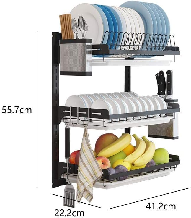 ➤ Dish Drying Rack, Saving Your Kitchen Space!● This dish drainer rack for kitchen counter combines dish rack, cup holder, knife holder, spoon holder and chopping board holder, and stores almost all kitchen supplies neatly. It can not only dry but also store dishes.➤ Product Specification● Product Name: Dish drainer rack● Material: Stainless steel● Dish Rack Size: As shown in the image✔ Multipurpose Dish Drainers● Dish drying rack complete with cutting board holder, cup rack, and utensil holders, perfectly match your daily family use.● With drain holes at the bottom of plastic utensil holder, your forks, spoons and other utensil would keep dry.✔ Sturdy & Long-Lasting● Our dish drainer rack is made of durable stainless steel with pray paint on the surface to prevent rust and long lasting use.● Anti-slip foot cushions makes sure this dish rack stand well and prevent the counter top against scratching.➤ Package Include● 1 x Dish Rack● 1 x Utensil Holder● 1 x Cutting Board Rack