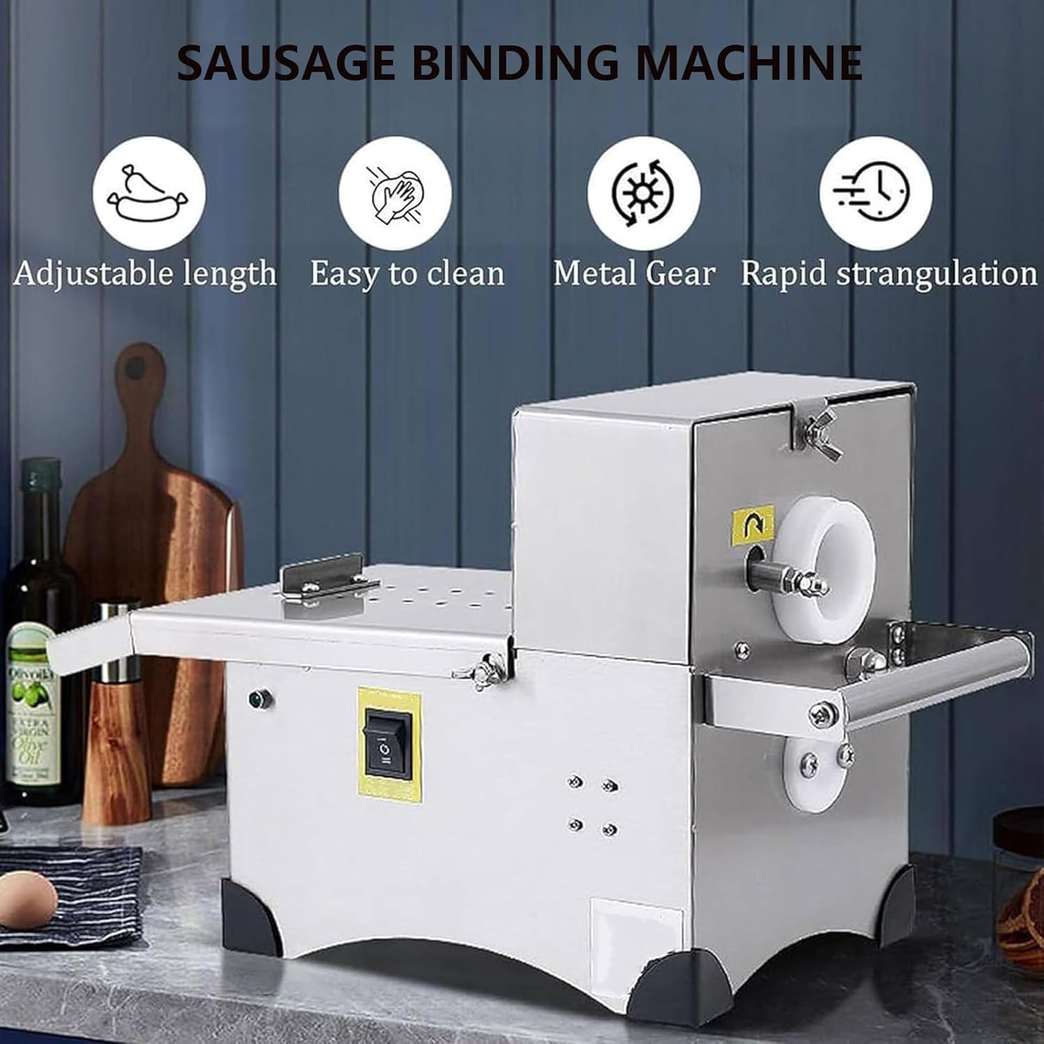The electric sausage tying machine is constructed from premium 304 food-grade stainless steel, ensuring durability, rust resistance, and food safety. It features a 50mm diameter hole for sausage placement and an adjustable sausage length option, making it suitable for various sausage sizes. You can customize the tightness of the binding line to meet your specific preferences.Features:- Improve work efficiency: Quickly and accurately bundle sausages, significantly enhancing production efficiency.- Easy to use: Simply insert the sausage into the machine and press the button to complete the binding.- Fasten firmly: High-quality strapping securely fastens the sausages, preventing them from falling apart or loosening.- Save time and effort: The electric sausage banding machine reduces manual operations compared to manual banding.- Strong adjustability: Bundling length is adjustable according to the size and firmness of different sausages.Specifications:- Material: 304 food-grade stainless steel- Input Voltage: 110V-60Hz/220V-50Hz- Power: 200W- Product Size: 21*45*26cmPackage Contents: - Sausage knotting machine - Foot switch- A roll of wire