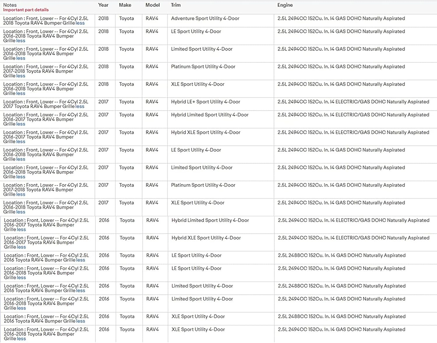 Are you looking for Front Bumper Grill Guard?Kspeed Black Mesh Grille is an ideal product for upgrading your vehicle appearance to a more aggressive sporty look!Product Description:Material:ABS PlasticColor:BlackPlacement on Vehicle: Front,LowerNumber of Pieces: 1Fitment Type:Direct Replacement Package Included:1 x Front Bumper Lower GrillFeatures:Make your car more colorful and increase safety during driving.Resistant to rust or corrosion. It helps protect the engine from damage caused by the stuff on the road, such as papers, plastic, broken glasses, stones, trash, etc.Front Replacement Sport Style GrilleMeets OEM specifications - Quality and fit are perfect.Compatible with:2016 2017 2018 Toyota RAV4 Adventure Sport Utility 4-Door 2016 2017 2018 Toyota RAV4 Hybrid LE+ Sport Utility 4-Door2016 2017 2018 Toyota RAV4 Hybrid Limited Sport Utility 4-Door2016 2017 2018 Toyota RAV4 Hybrid XLE Sport Utility 4-Door2016 2017 2018 Toyota RAV4 LE Sport Utility 4-Door2016 2017 2018 Toyota RAV4 Limited Sport Utility 4-Door2016 2017 2018 Toyota RAV4 Platinum Sport Utility 4-Door 2016 2017 2018 Toyota RAV4 XLE Plus Sport Utility 4-Door 2016 2017 2018 Toyota RAV4 XLE Sport Utility 4-DoorPlease check your compatibility before purchasing.INSTALLATION:This product recommends professional installation.Any damage during installation will not be refunded.