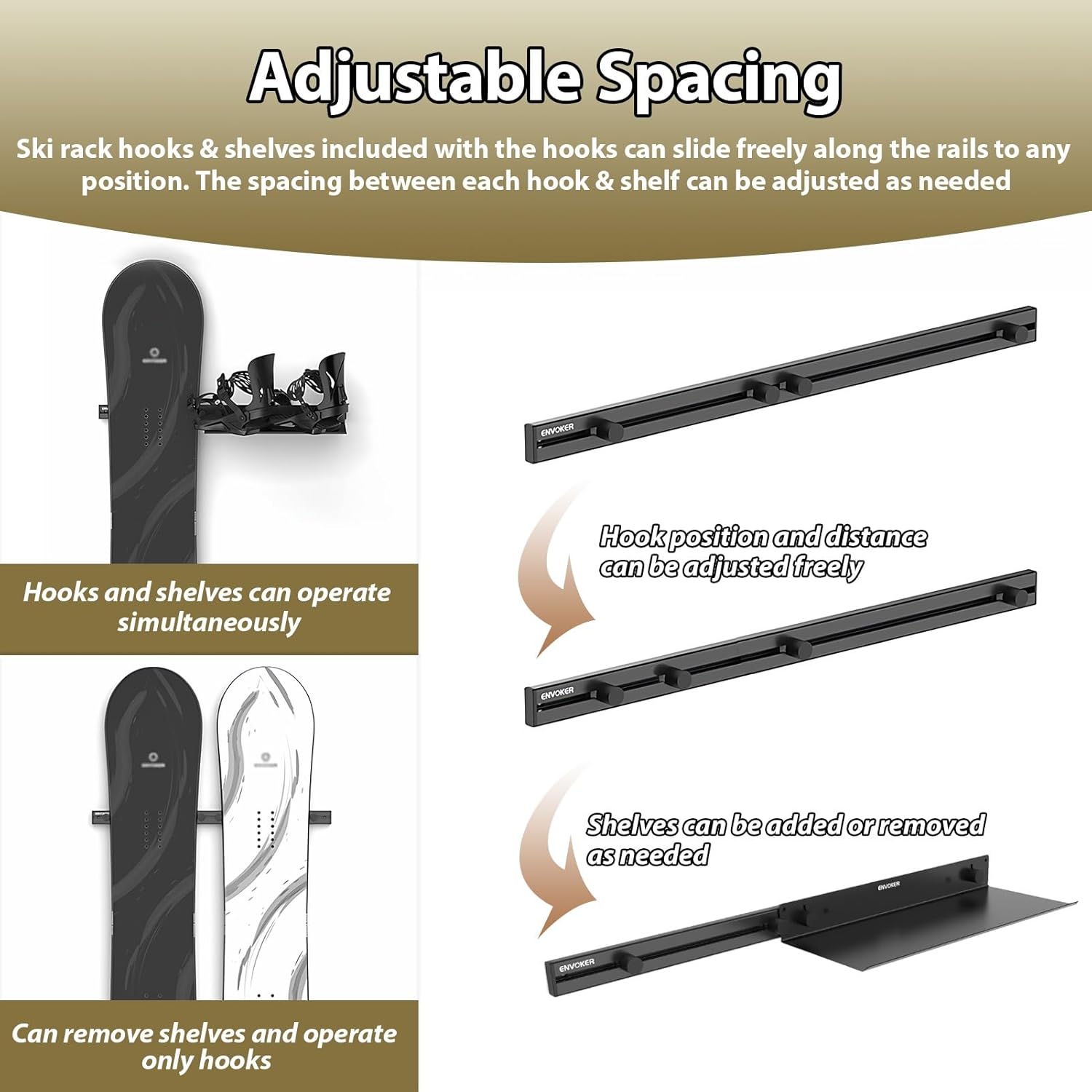 - Tired of traditional ski racks with limited capacity and bulky designs?- This ski rack features hook with adjustable shelves that slide freely to any position. Customize hook spacing to effortlessly accommodate more gear. The wall-mounted design saves valuable floor space.Specifications: - Material: Aluminum Alloy + High-Carbon Steel- Color: Black- Track Length: 70cm (27 1/2")- Shelf Length: 40cm (15 3/4")- Shelf Height: 3cm(1 1/8")- Shelf Width: 18cm(7 1/8")Features:- Sliding hooks allow for flexible spacing adjustments.- The included shelf provides additional storage for more snow gear.- Accommodates snow gear of all sizes.- Heavy-duty construction supports additional equipment.- Wall-mounted design maximizes valuable floor space.- Maximizes vertical space utilization.- Durable aluminum alloy construction ensures stable weight-bearing.- Rounded edges resist wear and prevent ski damage.- Effortless assembly in just 5 minutes.Packaging List:- 1 x Ski & Snowboard RackNote:- Manual measurement may have length error, please understan.- Artificial shooting may cause a slight color difference, please prevail in kind.